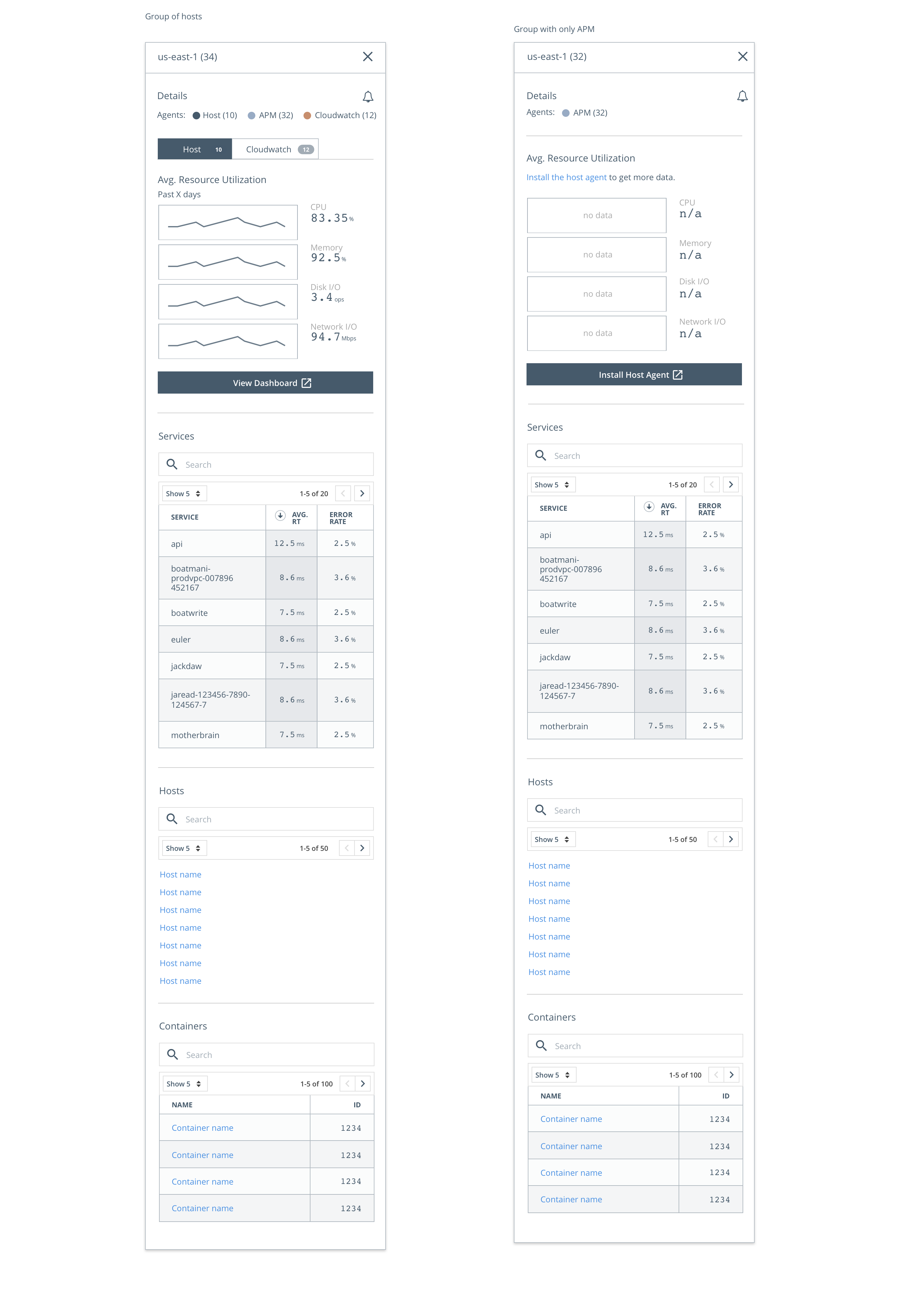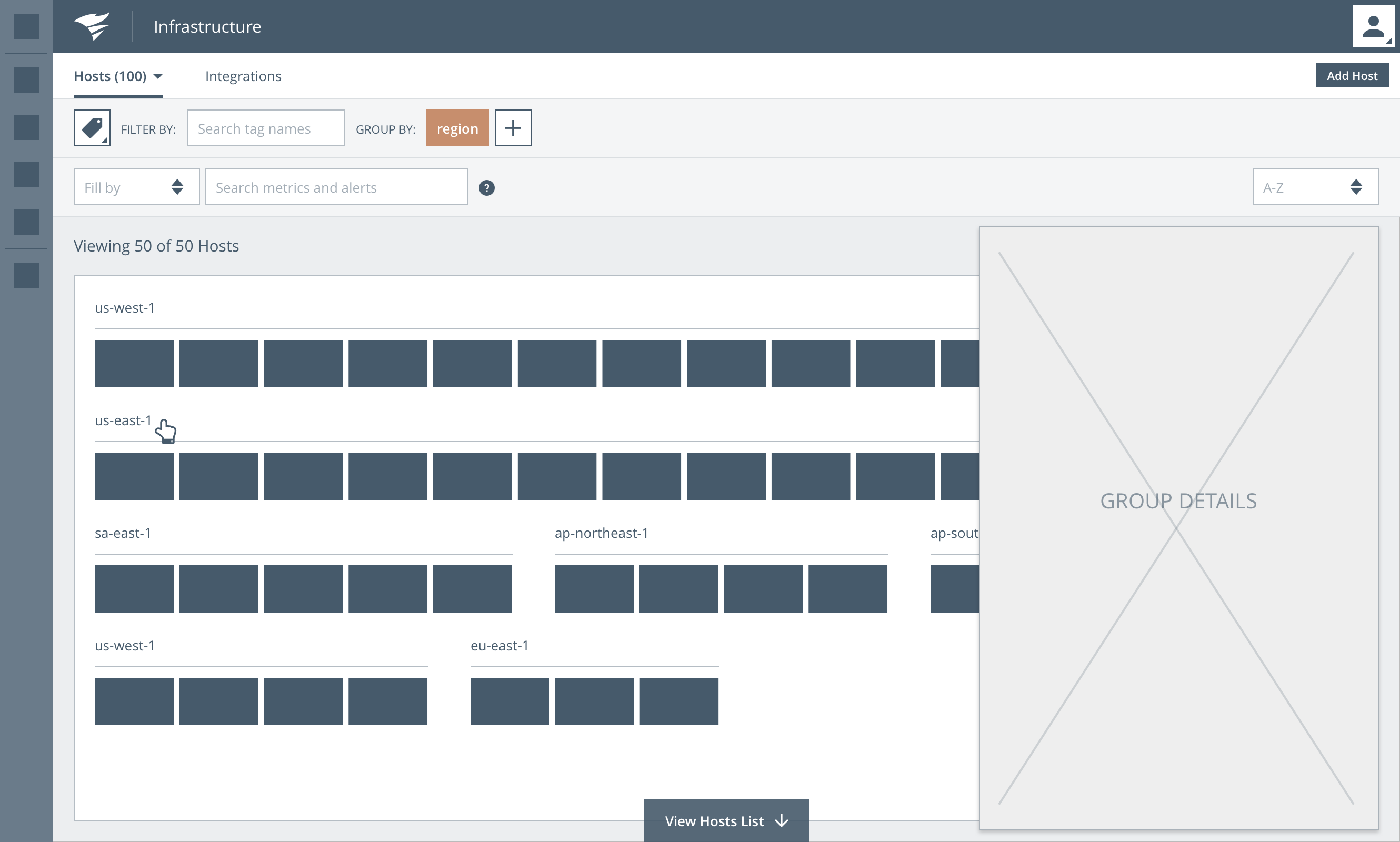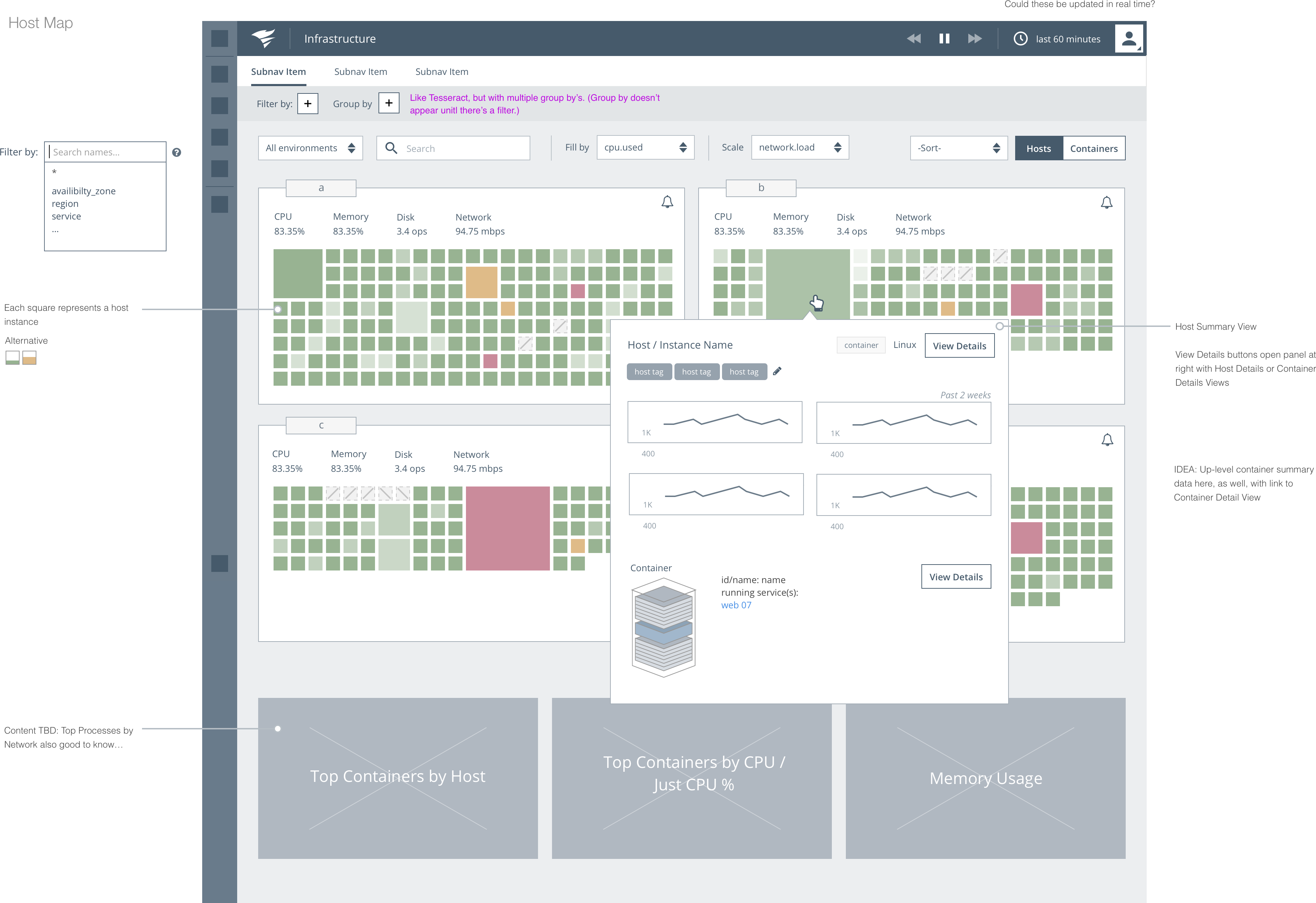 | Challenge: Users needed a way to monitor and visualize hundreds or even thousands of host / infrustructure instances. There were several variations of infrastructure to consider such as traditional hosts, containers and amazon web services. | Solution: Create a new user experience powered by an interactive "map" visualization that allows users to spot trends, filter and set threshholds for key server metrics. |
